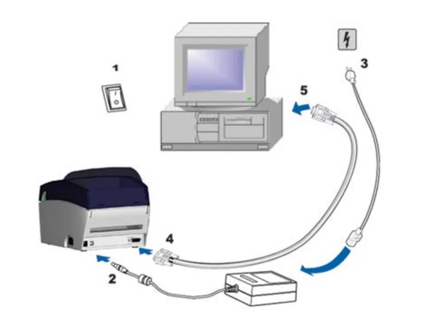 Connect the power cable (3) to the electrical outlet and to the power supply, then connect the power supply to the printer (2).